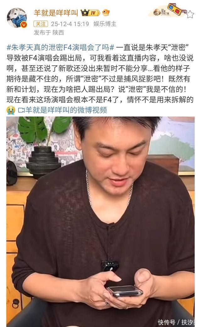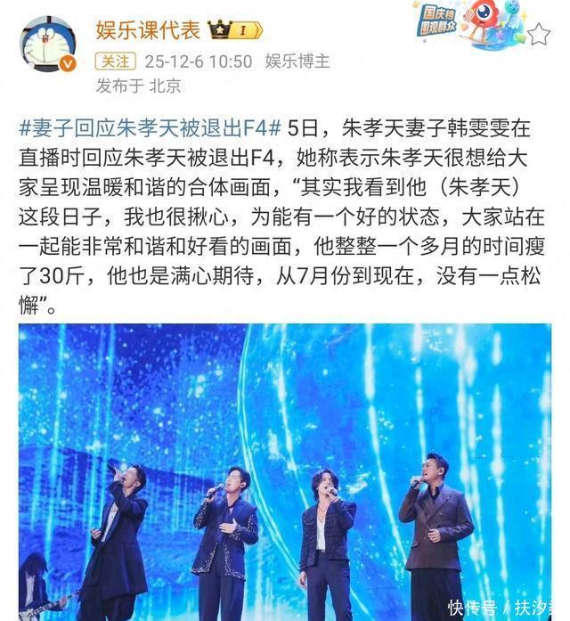 不光如此,朱孝天不仅没有出现在演唱者中,连后面的相关演出阵容,都没有朱孝天的名字。 对此,朱孝天妻子韩雯雯含泪直播,含含糊糊说了一些自己丈夫为F4合体暴瘦30斤却突遭除名的事情,引发了网友的热议。